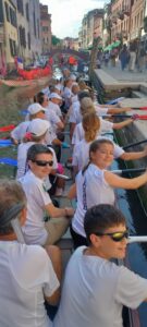 Nella mente si affollano tante emozioni: la sensazione di trionfo, di aver scritto una bella pagina della tua storia personale, la potenza di esserci riusciti, la gioia di fare di nuovo quel percorso che al mattino abbiamo fatto per partire per questa avventura e di essere di ritorno con un tempo di tre ore e mezza (su un tempo massimo di sei ore) con un Canal Grande a disposizione, senza ingorghi di barche perché siamo tra i primi. Poi l’emozione delle nostre due barche, Il Dragone e la Polinesiana, che si avvicinano al ponte di Rialto per fare “l’alza remi” sotto il ponte, con una folla di turisti che applaude proprio noi.