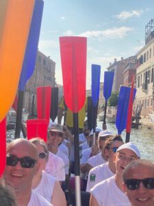 Arriviamo in Piazza San Marco, la musica “Veneziana” a volume altissimo, non sentiamo il cannone di inizio, ma non ci interessa affatto, siamo estasiati e felici di essere insieme a quella distesa variopinta di barche e braccia che remano e non ci rendiamo neppure conto di cosa stiamo facendo.