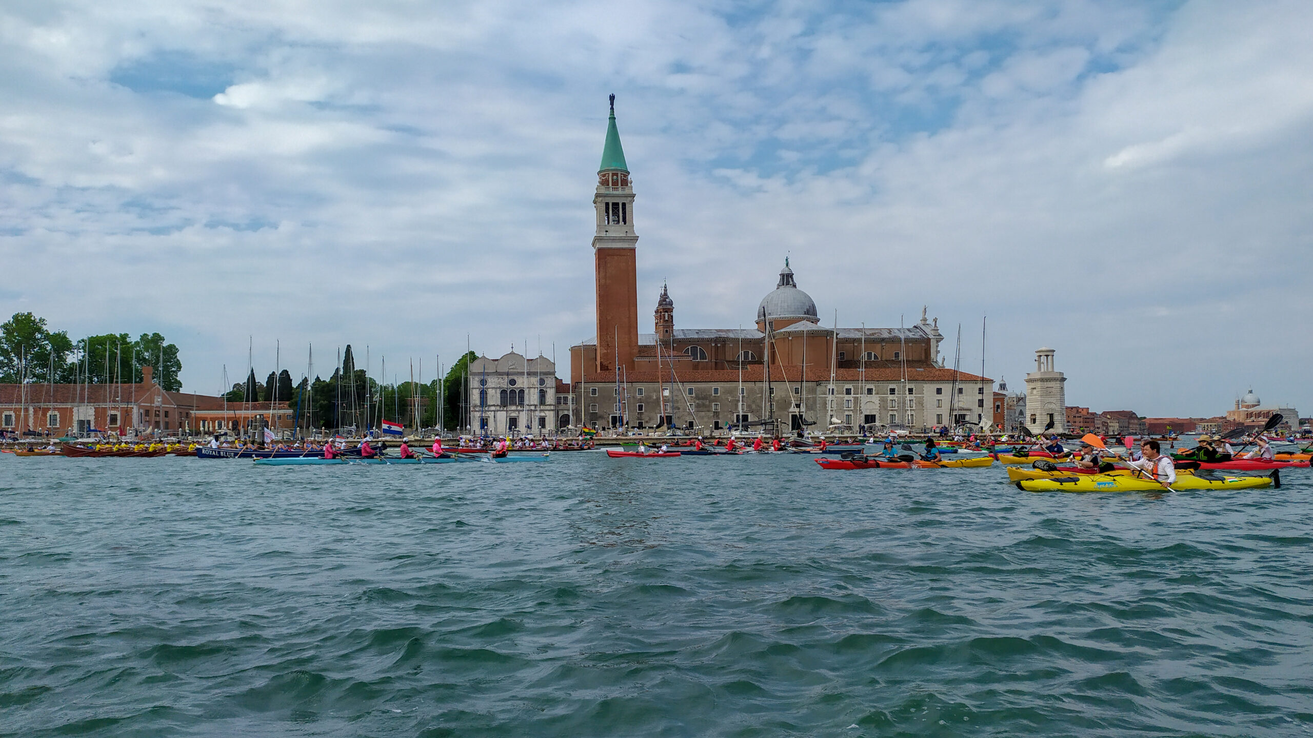 Una vedetta della Guardia Costiera aspetta in un punto per dirci dove andare. Siamo in mare aperto, in lontananza si vede un lembo di terra che sembra compatto e il campanile di San Marco. Il mondo sembra a due dimensioni. Non è la fatica ma la mancanza di punti di riferimento che ci fa sembrare lungo quel tratto.